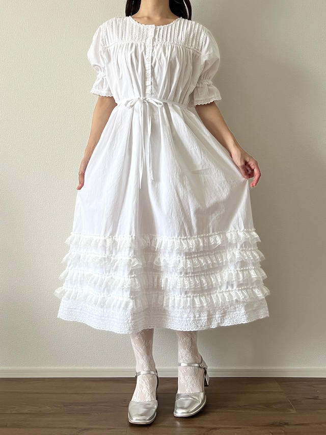 remake item まるでホイップクリームのような 裾のレースがアクセントになるワンピース。 長袖のシンプルなワンピースを femerryらしい装飾で彩り、 そしてキャンディのようなパフ袖に リメイクしました。 ウエスト部分に使える 細めのリボンを付属しているので、 シルエットは自由自在。 ふくらはぎが隠れる程度の着丈なので デニムパンツなどとのレイヤードスタイルも お楽しみいただけます。 〈平置き寸法〉 着用モデル身長(154cm) 総丈:112cm 肩幅:41.5cm 身幅:59.5cm 袖丈:30cm 袖口幅:10.5cm〜19cm(ゴムあり) ※多少の誤差はご容赦くださいませ。 ※裏地なしのため、光にあたると透け感がございます。(撮影時はペチコートを着用しています) 〈ダメージ〉 フロント部分にヴィンテージ特有のダメージ(茶色のシミ)がございます。また、全体に古着商品特有の使用感があります。画像19枚目をご確認ください。 実際と若干お色味が異なる場合があります、ご了承お願いいたします。 お客様のご都合によるキャンセル、返品、交換はお断りしております。