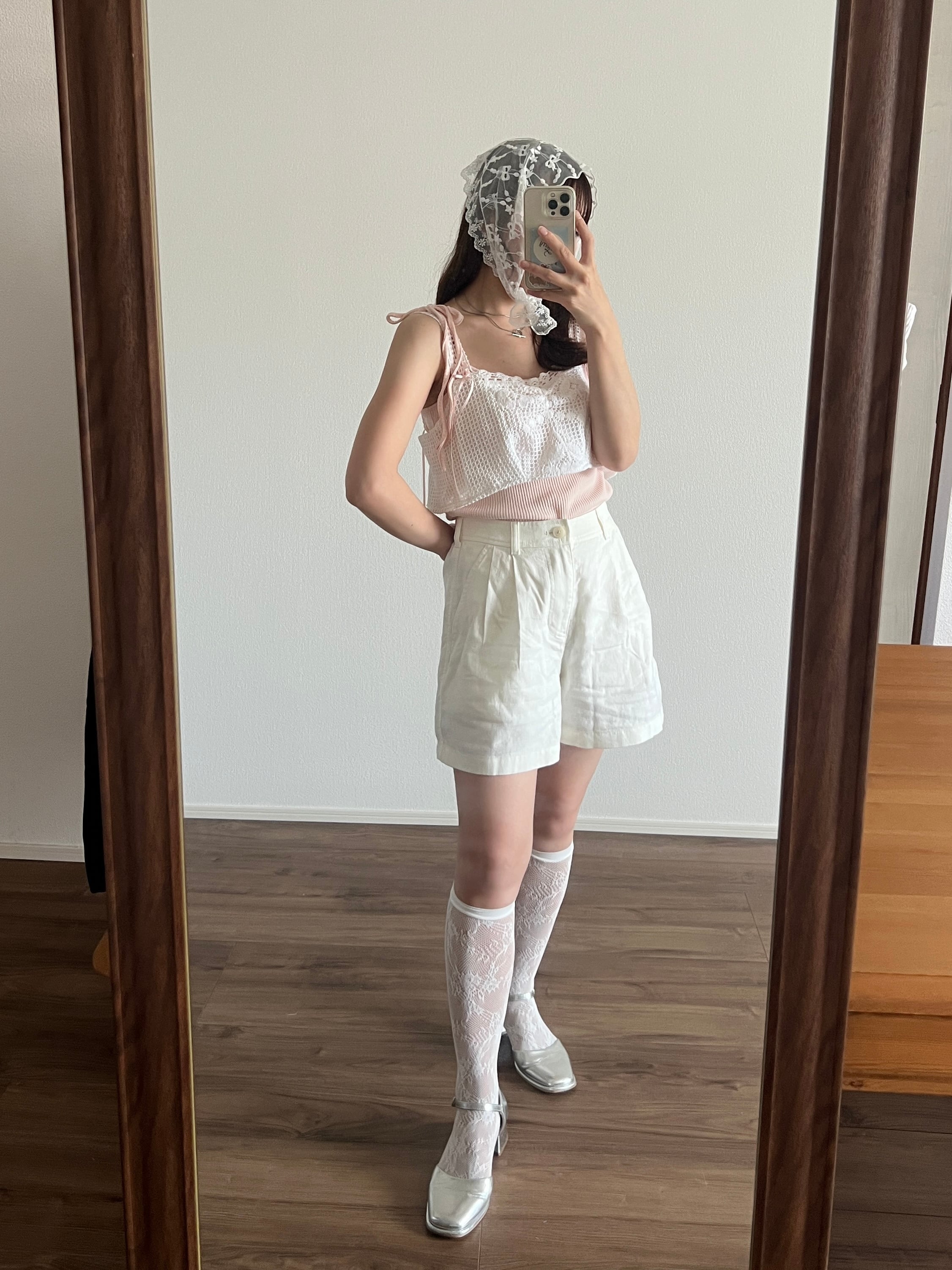 肩には柔らかなピンク色のリボンを通して