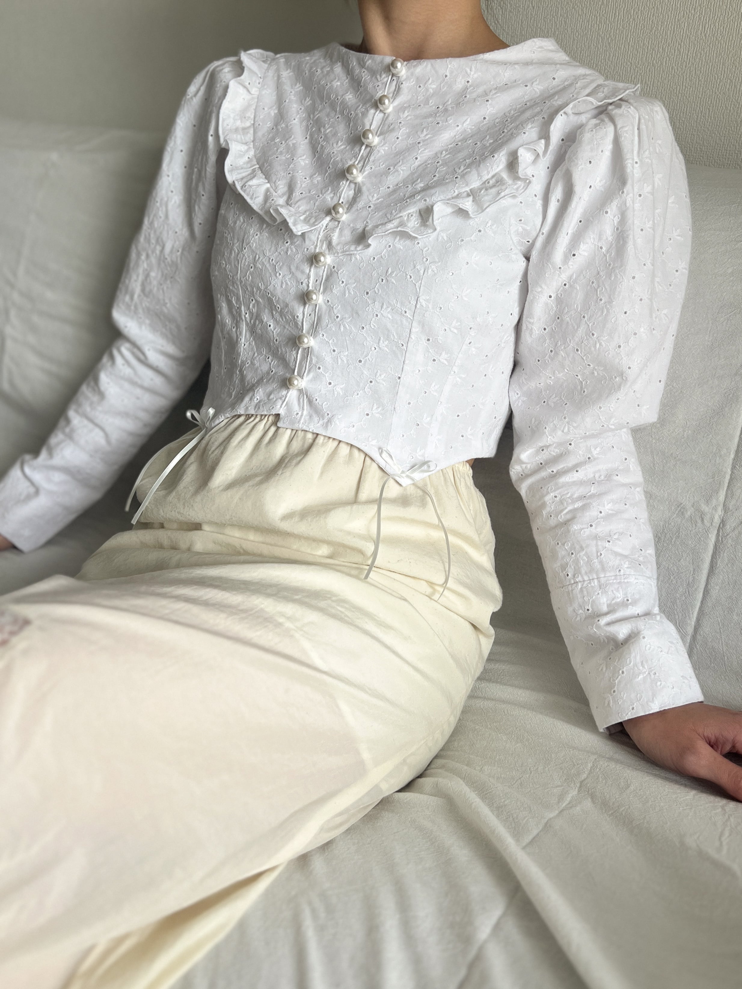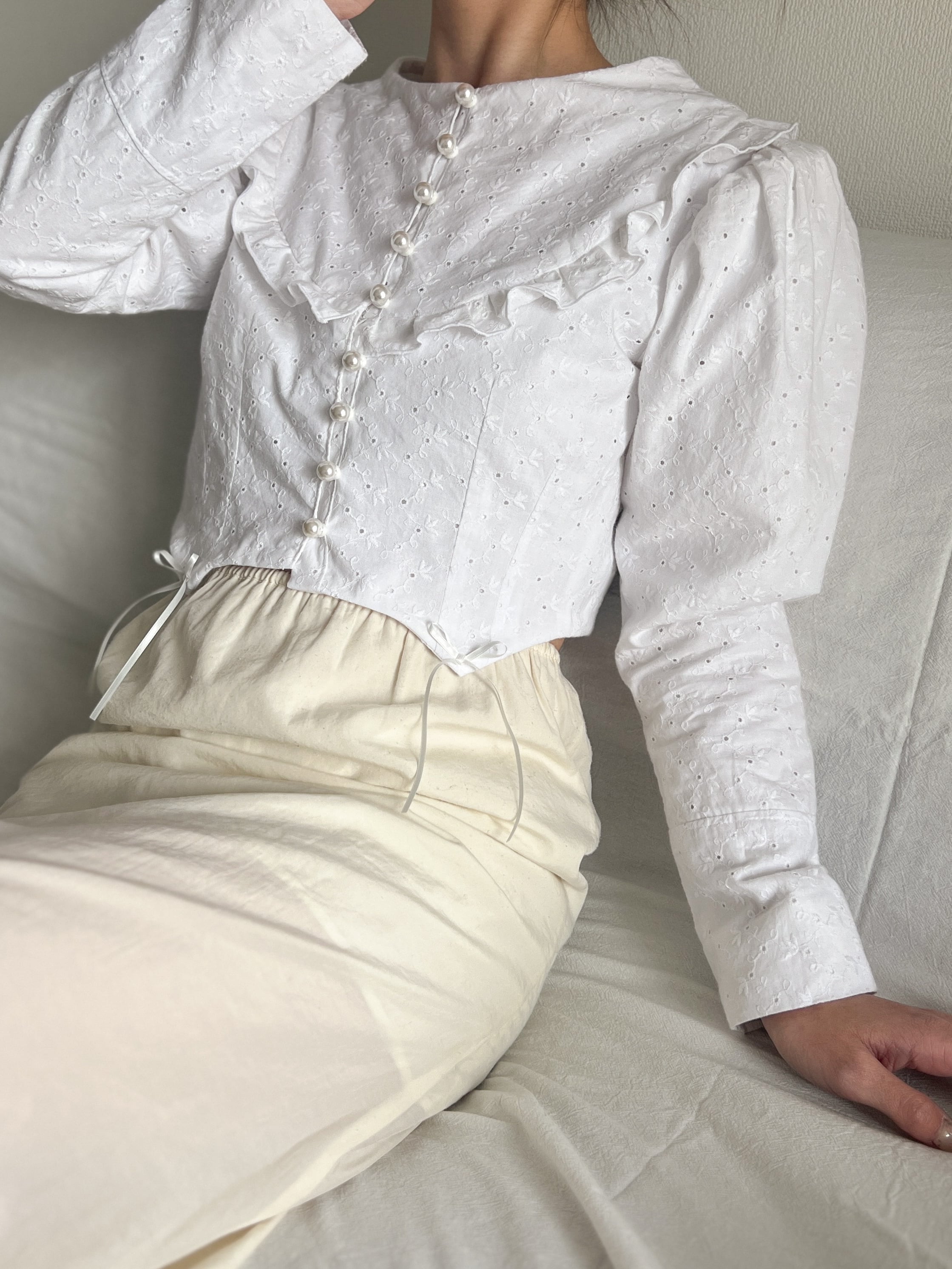 胸元にはパールボタンをふんだんに使用し、