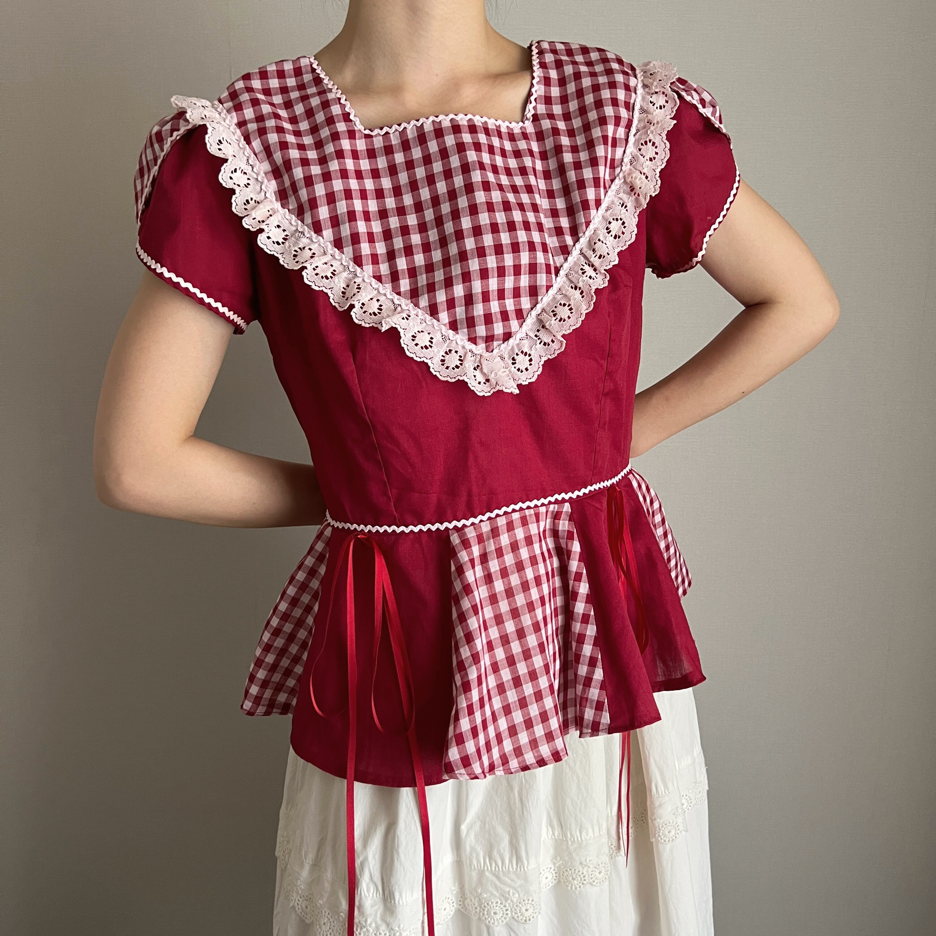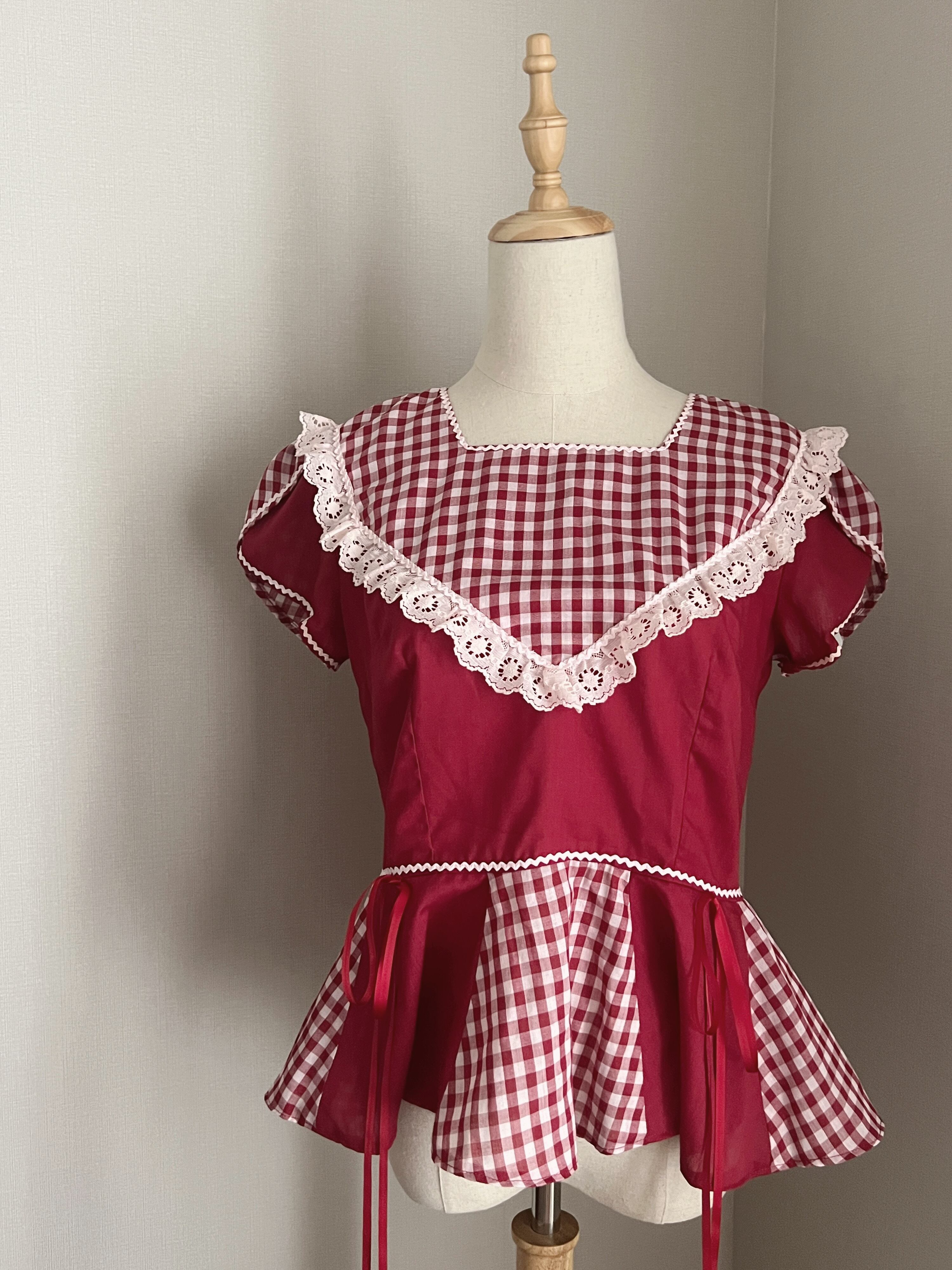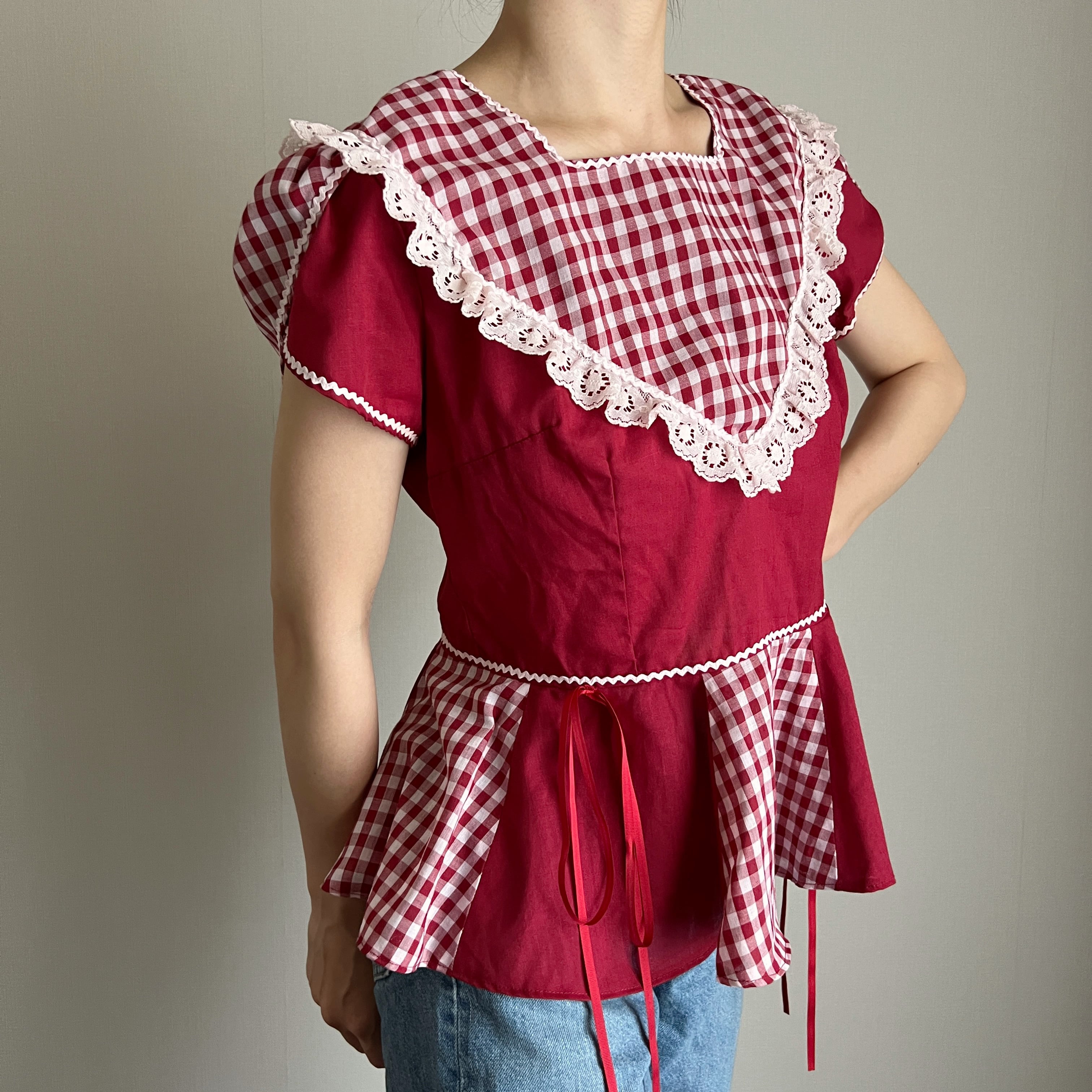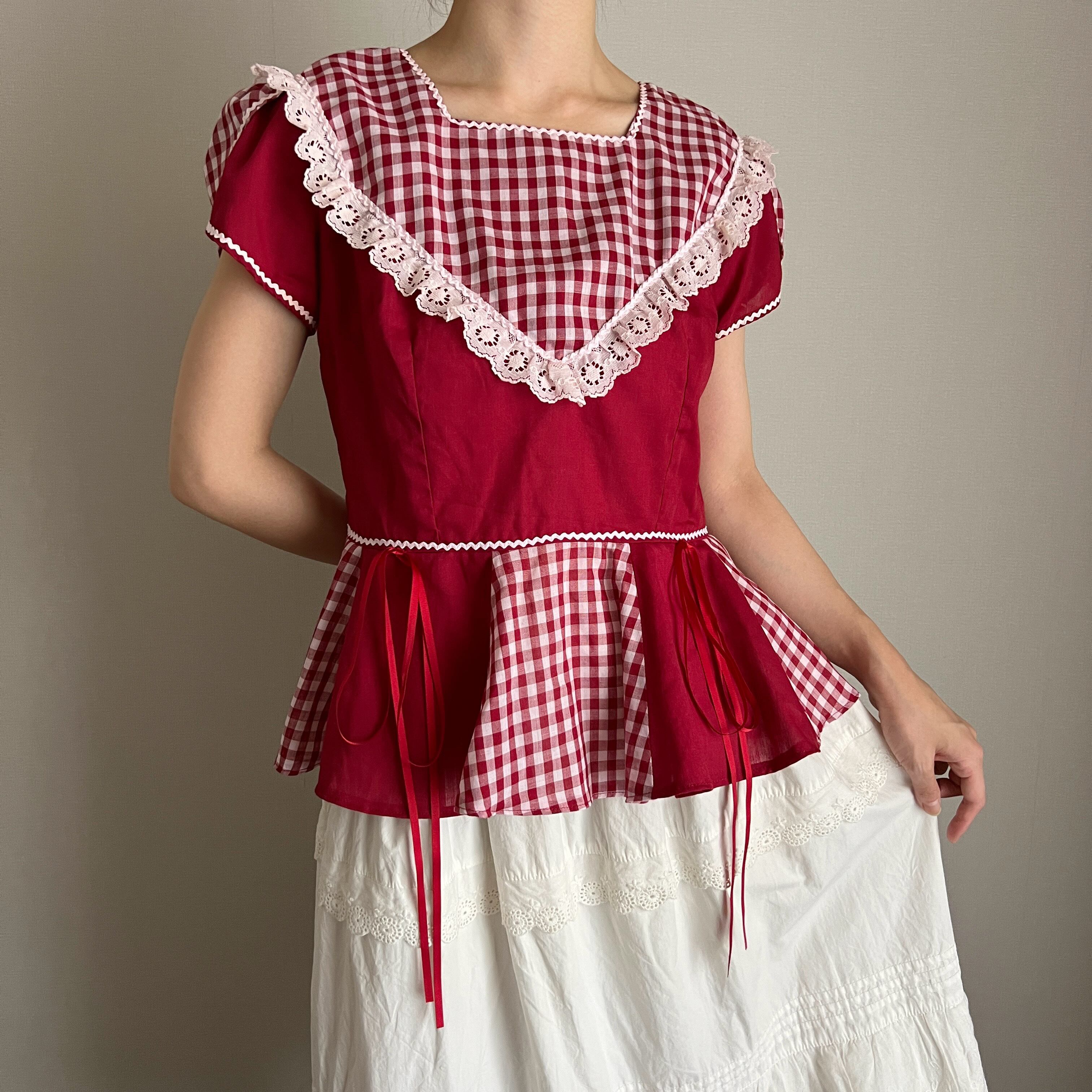 赤色×ギンガムチェックのブラウス。