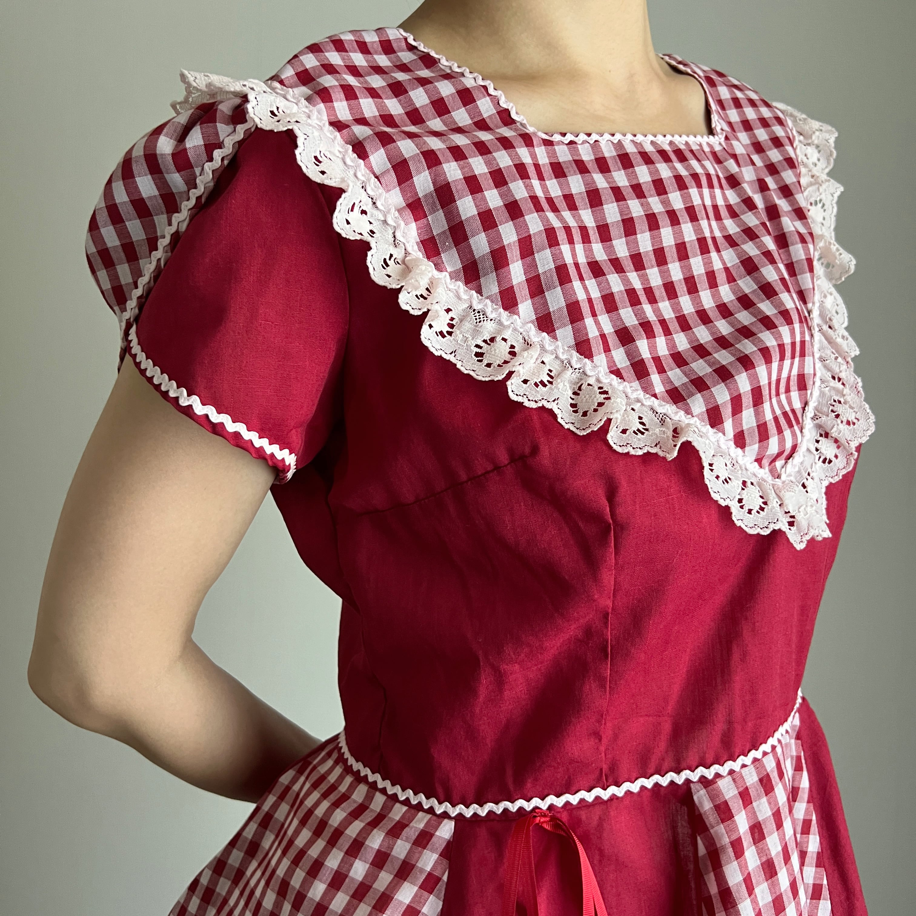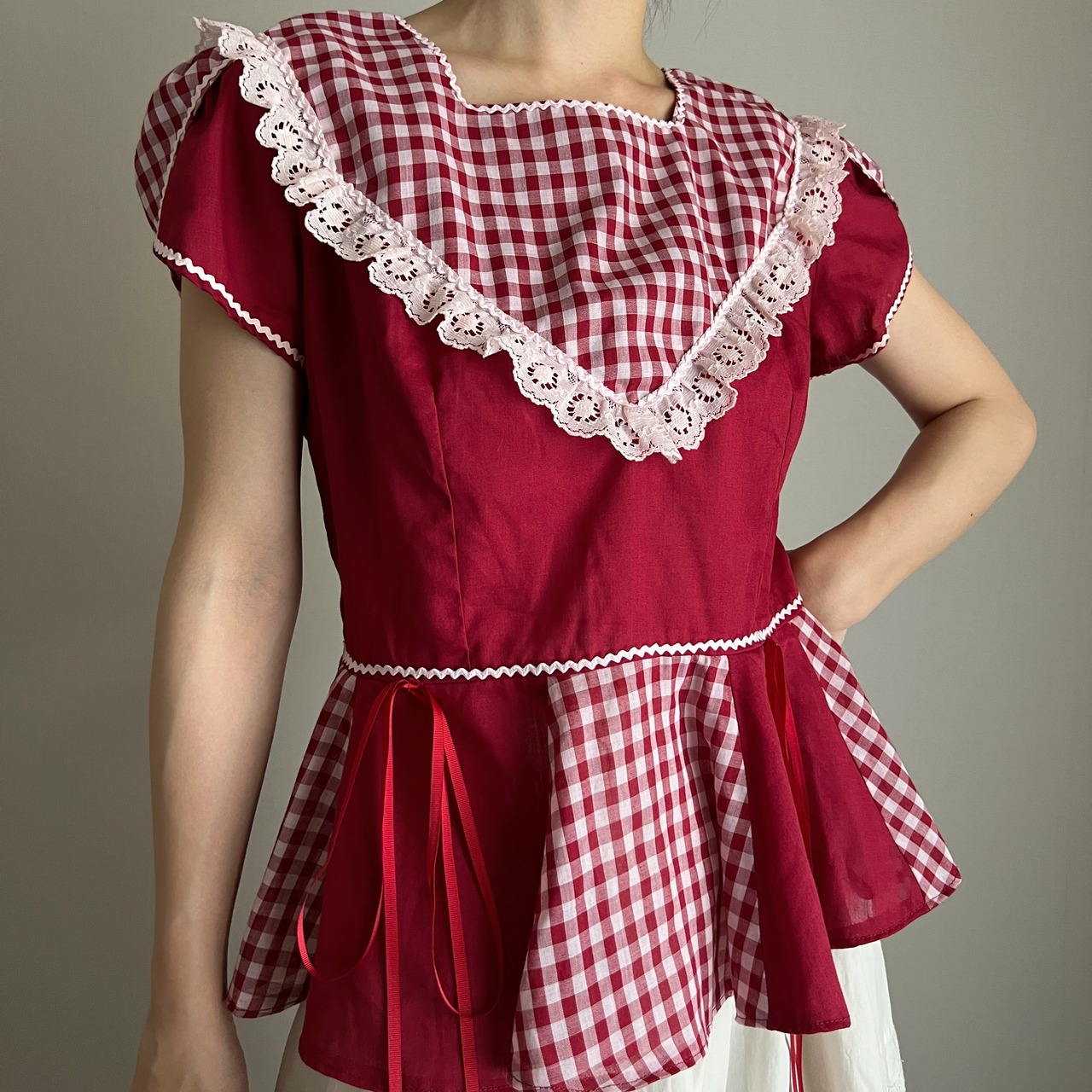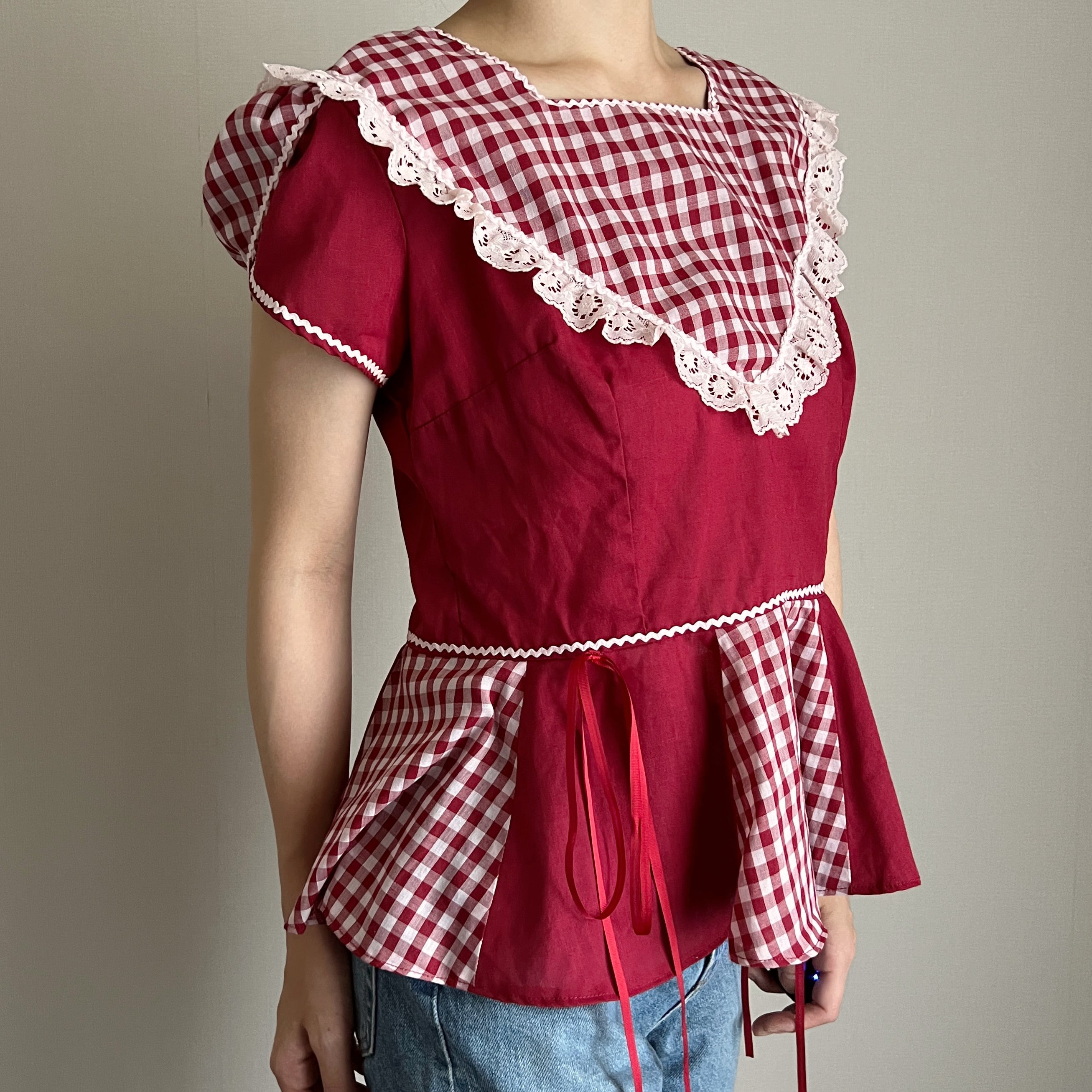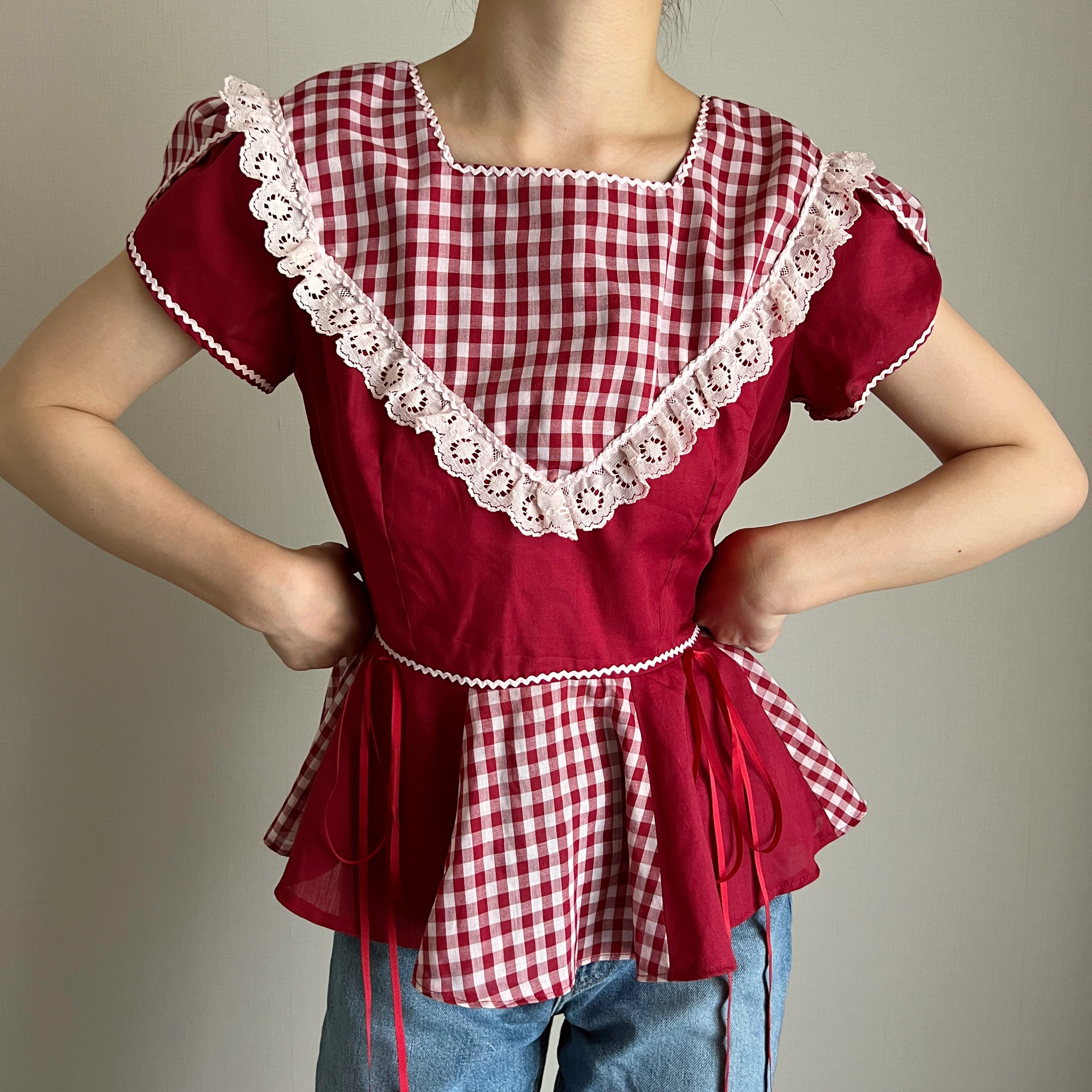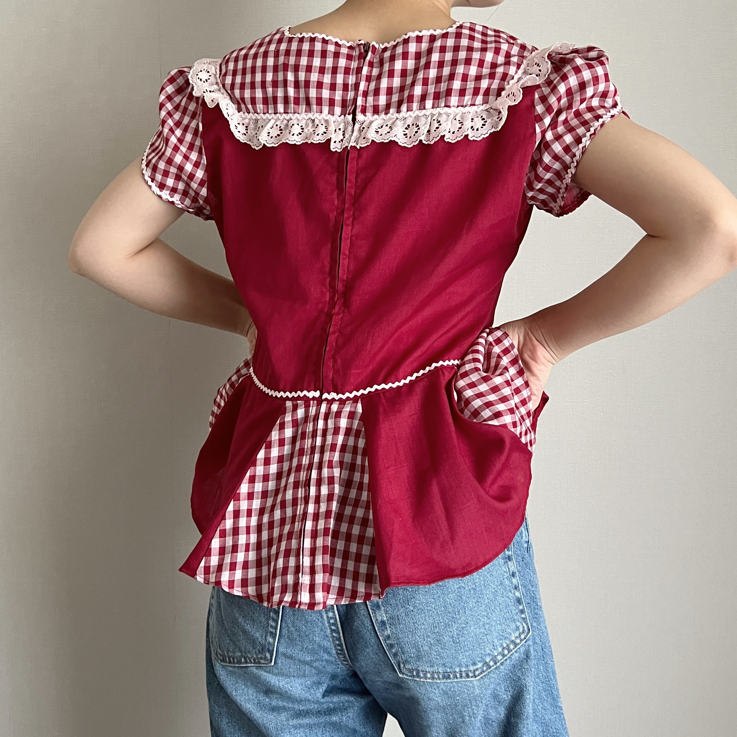 赤色×ギンガムチェックのブラウス。
